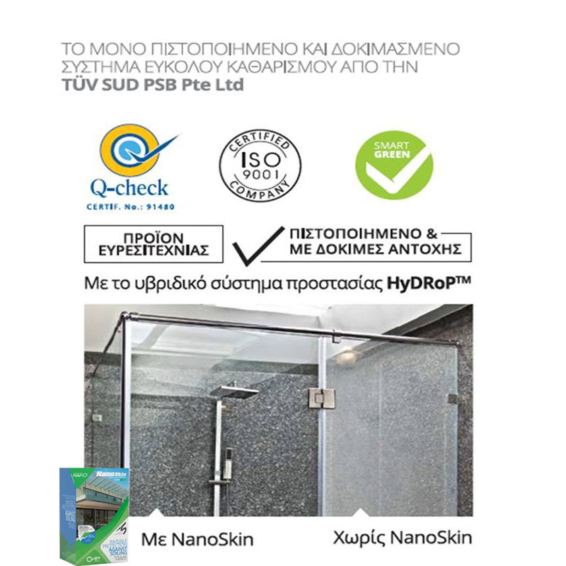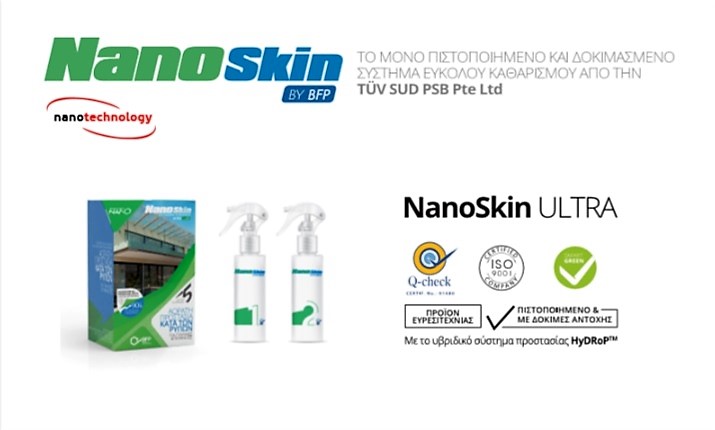 Το Nano Skin Ultra είναι ένα πρωτοποριακό προϊόν, το οποίο δημιουργεί στις γυάλινες επιφάνειες ένα αόρατο, εξαιρετικά ανθεκτικό φιλμ, που τις καθιστά αντικολλητικές σε άλατα, σκόνη και βρομιές, κάνοντας έτσι τον καθαρισμό πολύ πιο εύκολο και λιγότερα συχνό. Παράλληλα, αποτρέπει τις αλλοιώσεις που προκαλούν οι αποθέσεις ρύπων και η διάβρωση.