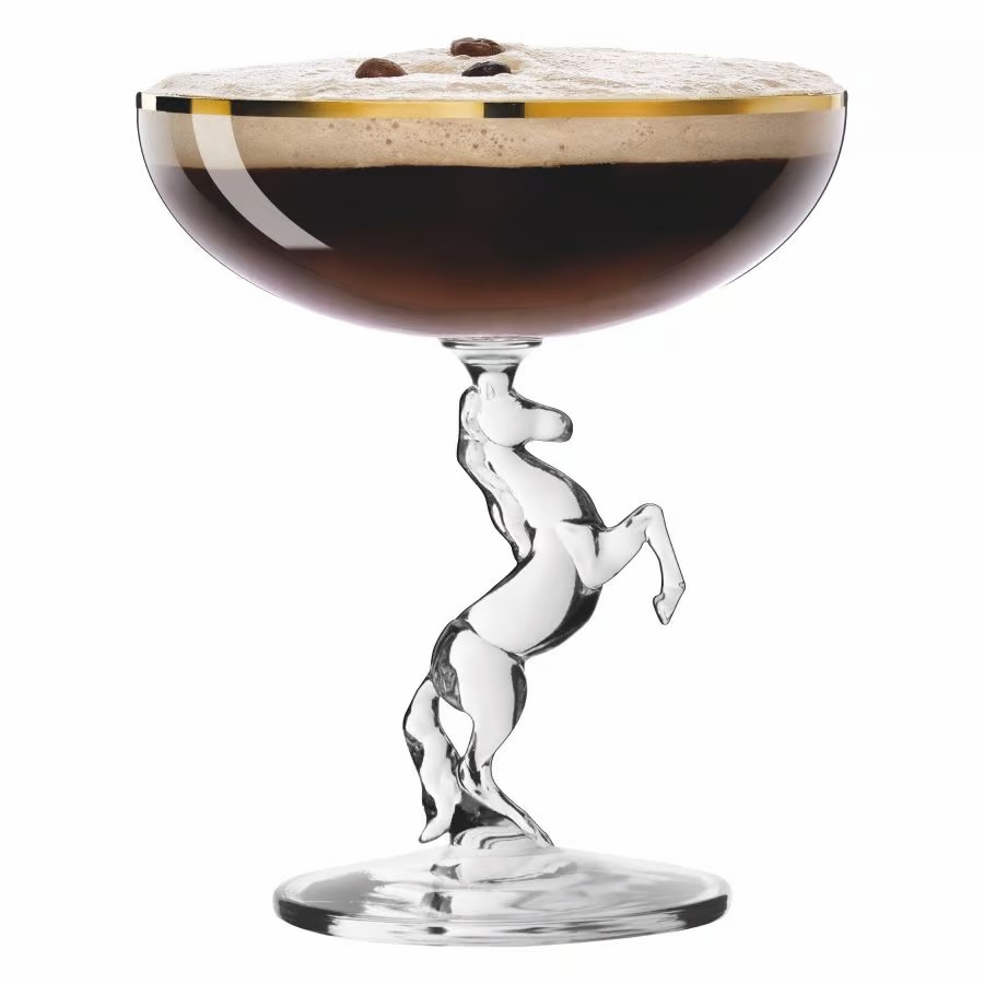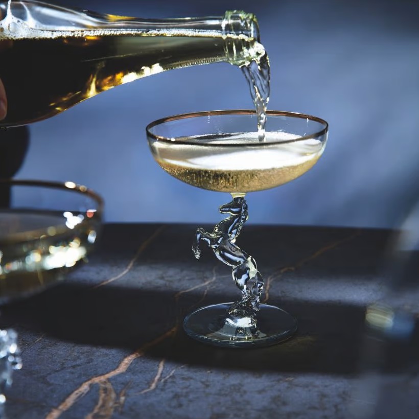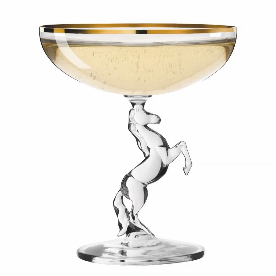 Ένα ποτήρι που ενσαρκώνει την ένωση δύναμης και κομψότητας: Η ποτηροθήκη σαμπάνιας τύπου coupe στηρίζεται σε στέλεχος σε σχήμα αλόγου που σηκώνεται όρθιο, σύμβολο κίνησης και υπερηφάνειας. Η λεπτή χρυσή επένδυση στο χείλος προσθέτει μια νότα εκλέπτυνσης στο σχέδιο και αναδεικνύει τον αποκλειστικό του χαρακτήρα.