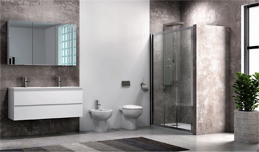 Καμπίνα μπάνιου τοίχο-τοίχο, μοντέλο Penta 300 με ένα σταθερό φύλλο και δύο επάλληλα συρόμενα