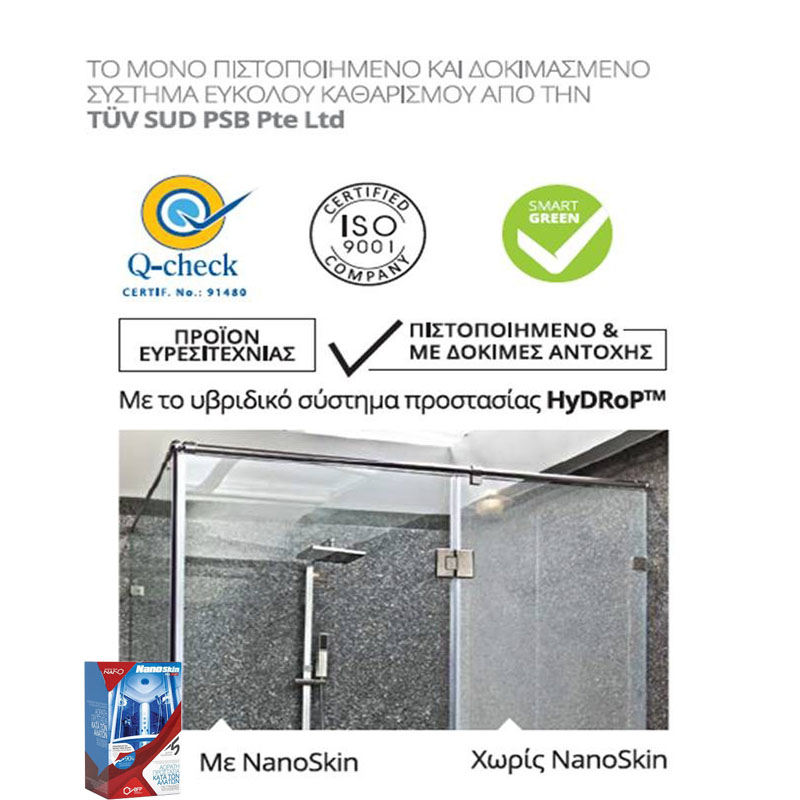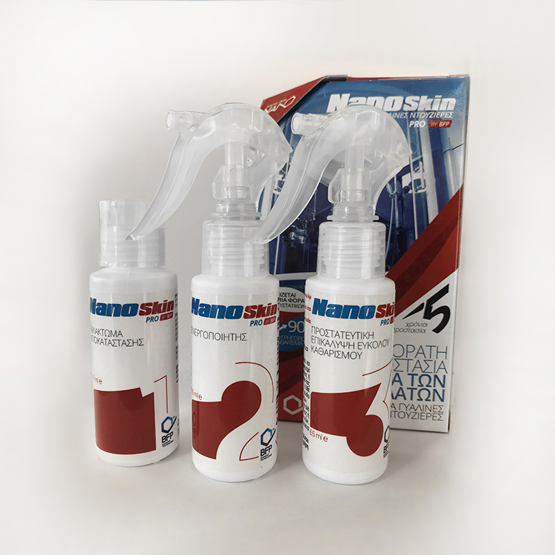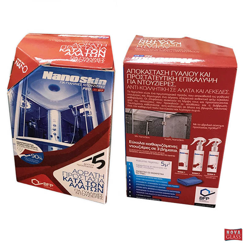 Το Nano Skin Pro είναι ένα πρωτοποριακό προϊόν, το οποίο δημιουργεί στις γυάλινες επιφάνειες ένα αόρατο, εξαιρετικά ανθεκτικό φιλμ, που τις καθιστά αντικολλητικές σε άλατα, σκόνη και βρομιές, κάνοντας έτσι τον καθαρισμό πολύ πιο εύκολο και λιγότερα συχνό. Παράλληλα, αποτρέπει τις αλλοιώσεις που προκαλούν οι αποθέσεις ρύπων και η διάβρωση.