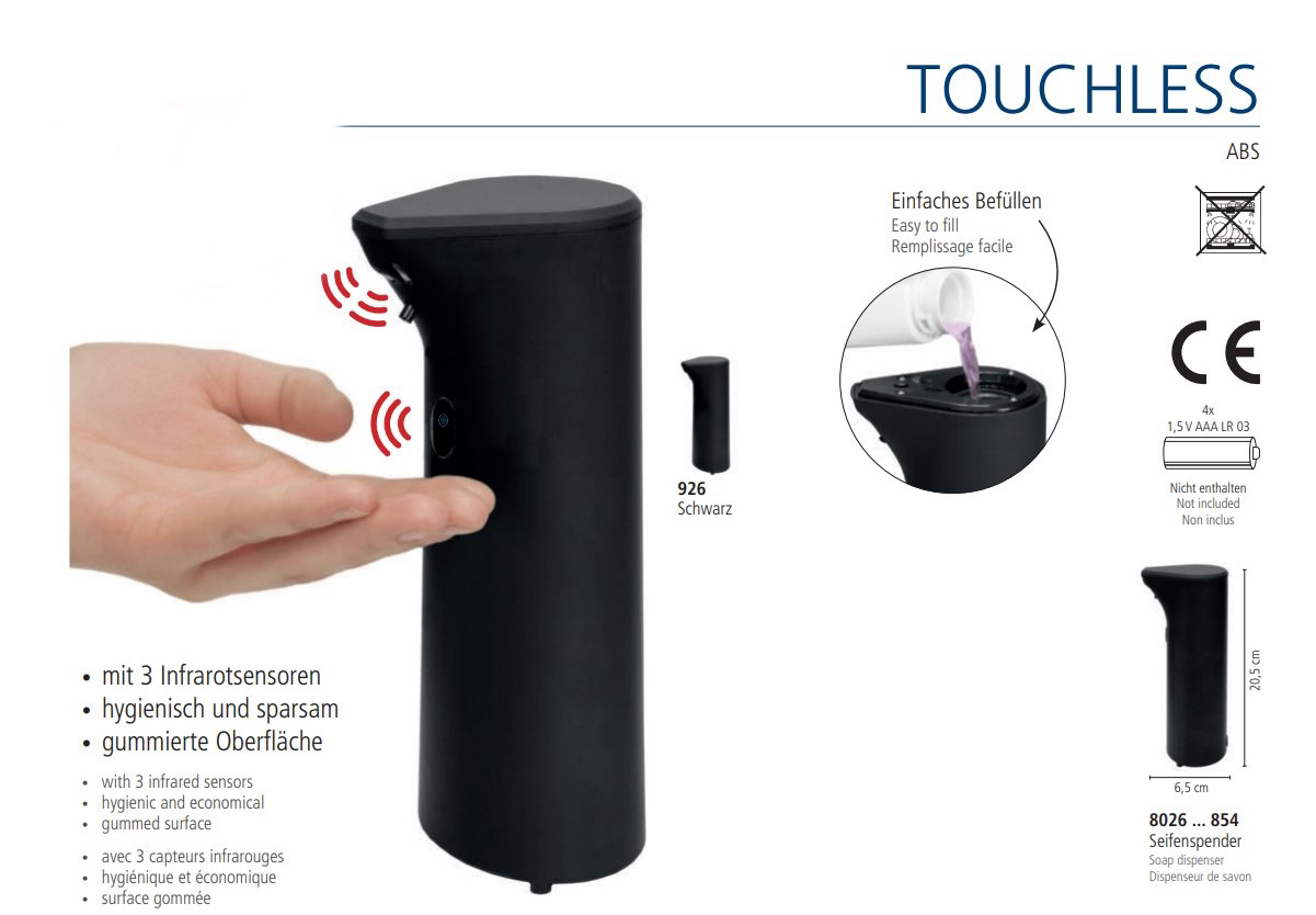 Η υψηλή ποιότητα του, σε συνδυασμό με το μοντέρνο σχεδιασμό του και την ελαστική του επιφάνεια το κάνει μοναδικό. Τρεις έξυπνοι αισθητήρες υπερύθρων επιτρέπουν την ανέπαφη διανομή του υγρού σαπουνιού, ώστε να βγάζει την απαραίτητη ποσότητα όταν ανιχνεύει την παρουσία των χεριών σας. Μετά τη χρήση μεταβαίνει αυτόματα σε κατάσταση αναστολής.Φυσικά, μπορείτε επίσης να το ενεργοποιήσετε και να το απενεργοποιήσετε χρησιμοποιώντας το διακόπτη στο μπροστινό μέρος.