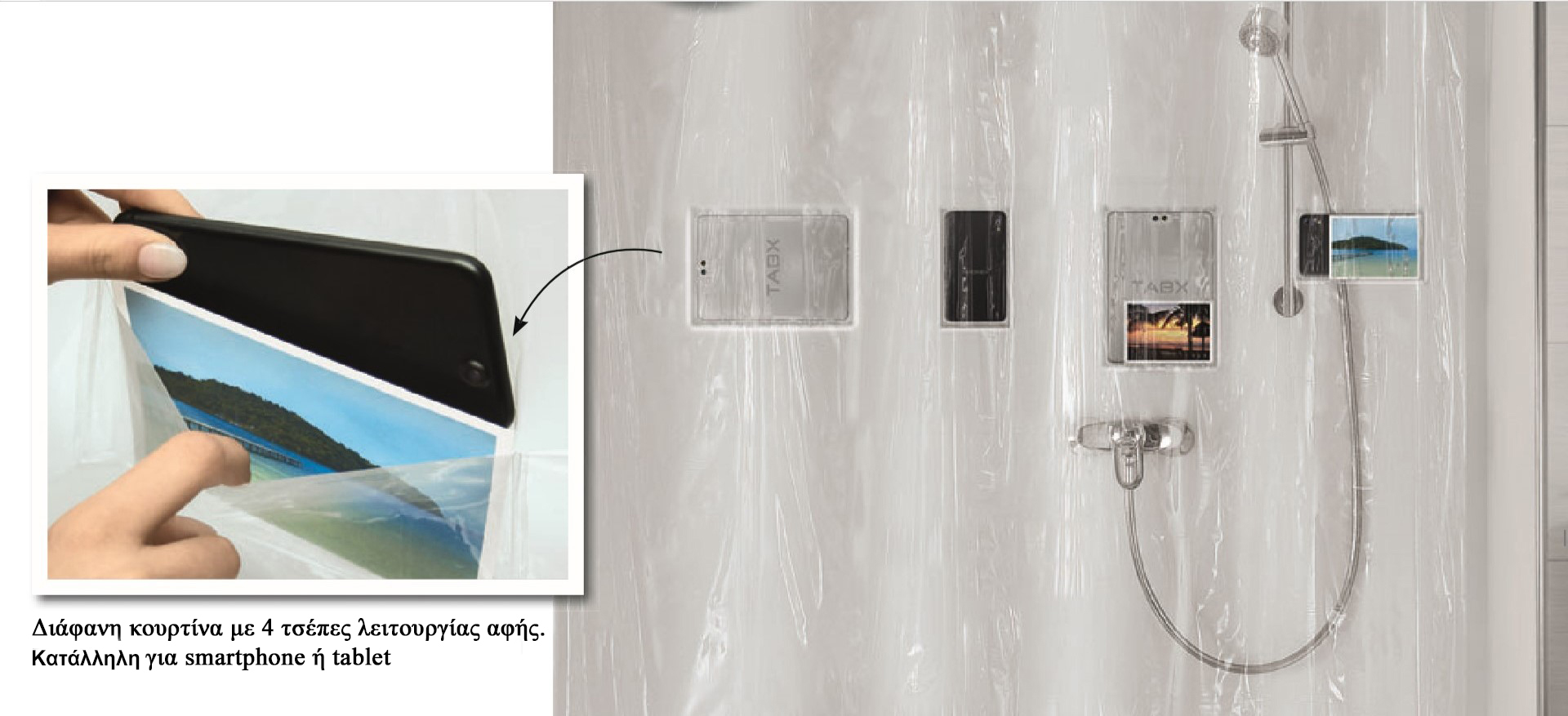 Η Γερμανική κουρτίνα μπάνιου Pocket είναι πολύ πρακτική, καθώς διαθέτει τέσσερεις θήκες με λειτουργία αφής, για να τοποθετείτε το κινητό ή το τάμπλετ σας
