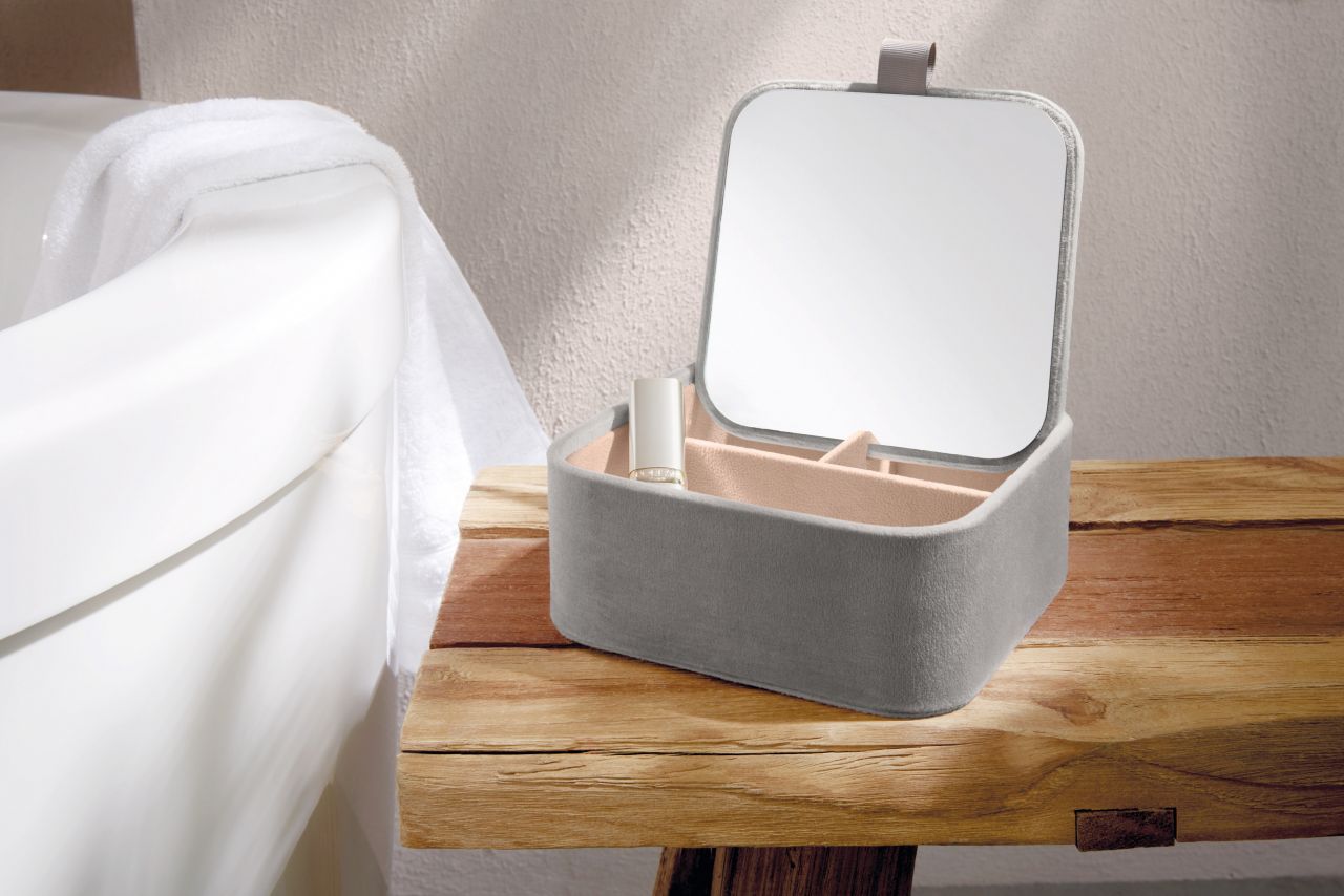 Ένα ιδιαίτερο αξεσουάρ για την αποθήκευση κοσμημάτων και καλλυντικών, είναι επίσης πολύ πρακτικό γιατί έχει ενσωματωμένο καθρέφτη που βρίσκεται στο εσωτερικό του καπακιού και μπορεί να συνδεθεί εύκολα στο κουτί.