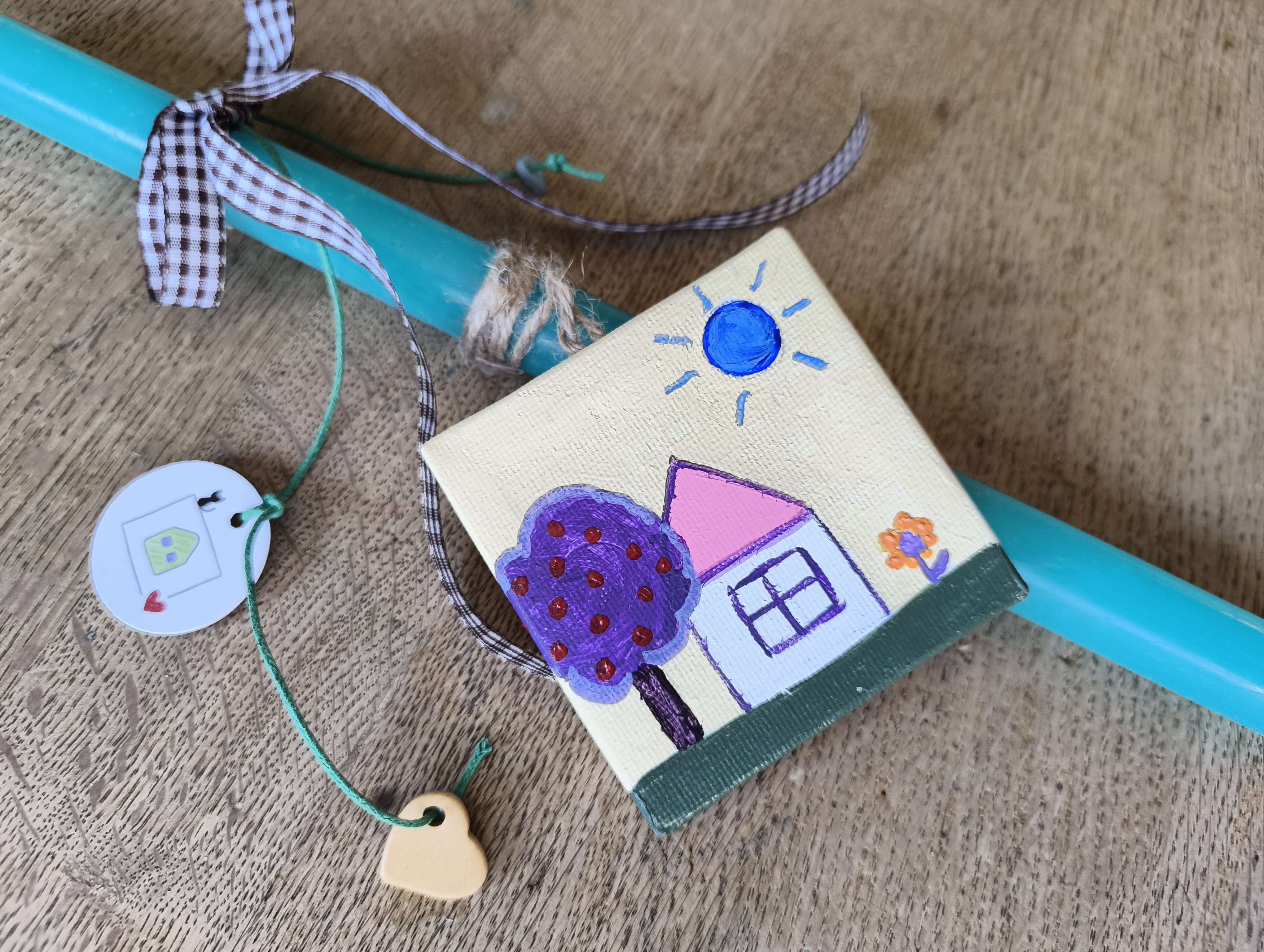 Χειροποίητη Λαμπάδα με καδράκι ζωγραφισμένο στο χέρι διαστάσεων 7x7 εκ , το οποίο μπορεί να χρησιμοποιηθεί ως διακοσμητικό.