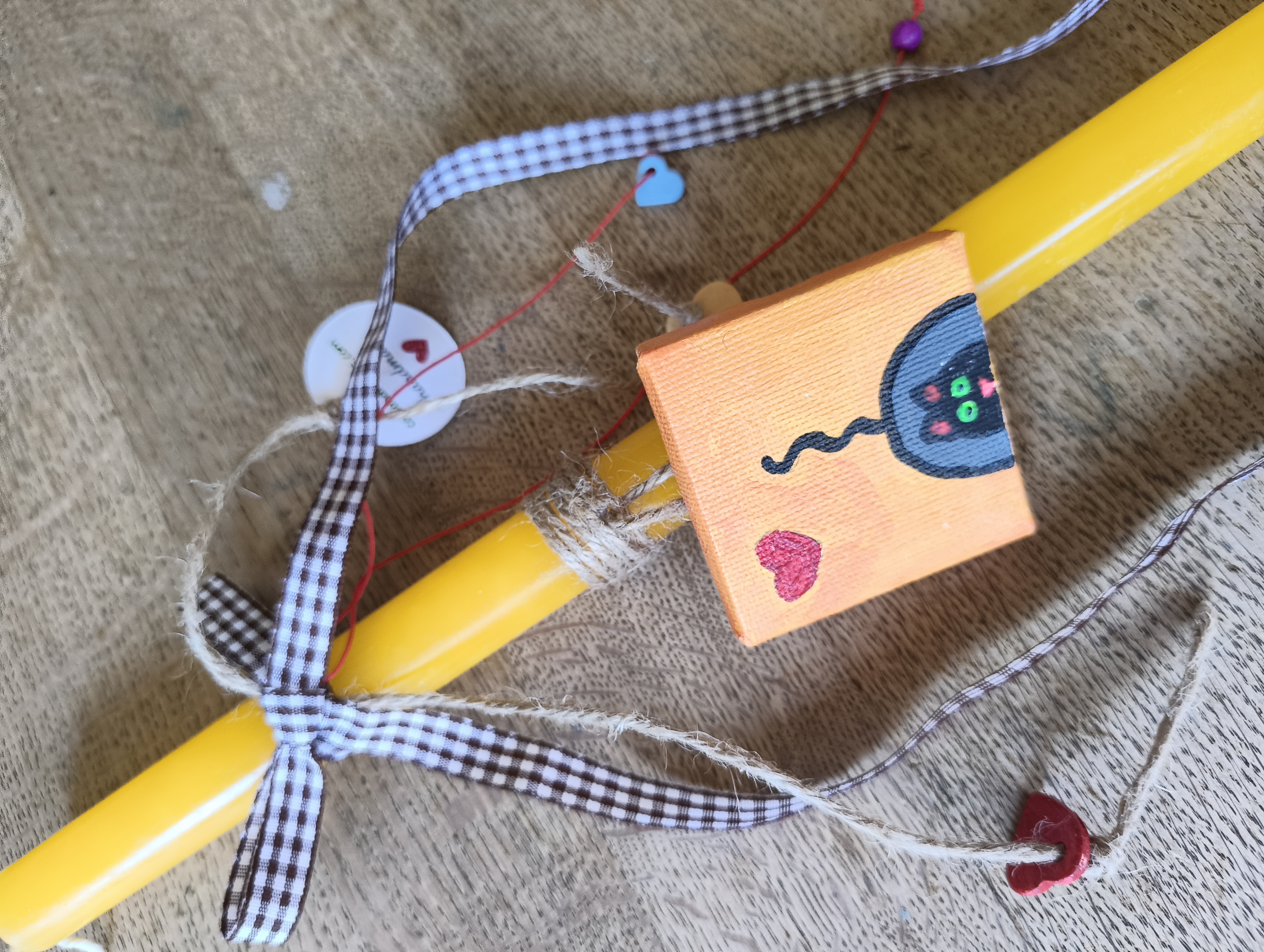 Χειροποίητη Λαμπάδα με καδράκι ζωγραφισμένο στο χέρι διαστάσεων 5x5 εκ , το οποίο μπορεί να χρησιμοποιηθεί ως διακοσμητικό.
